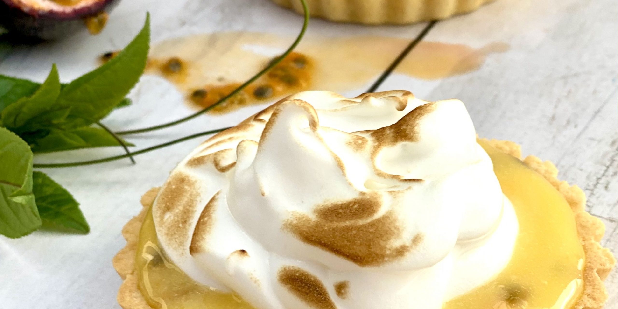 Spoon meringue onto tart filling and bake at 160°C until meringue is lightly toasted.