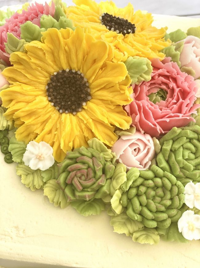 Learn how to pipe a large buttercream Sunflower using a cupped flower nail. Learn how to pipe succulent dessert roses, cacti and Ranunculus to create an eclectic floral cake topper.